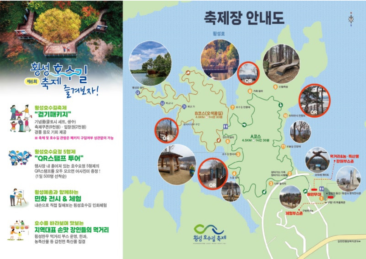 횡성호수길축제가 열리는 5구간은 '가족길'이라고도 불리며, 아이들부터 노인까지 누구나 부담 없이 걸을 수 있는 비교적 평탄한 코스입니다. 축제 기간에는 두 가지 코스가 운영됩니다.