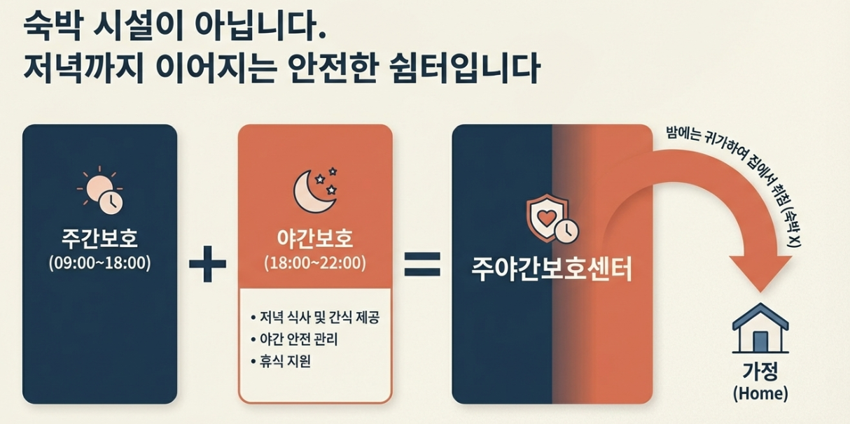 주야간보호센터는 기본적인 주간보호센터 서비스에 ‘야간 돌봄’이 추가된 형태입니다.