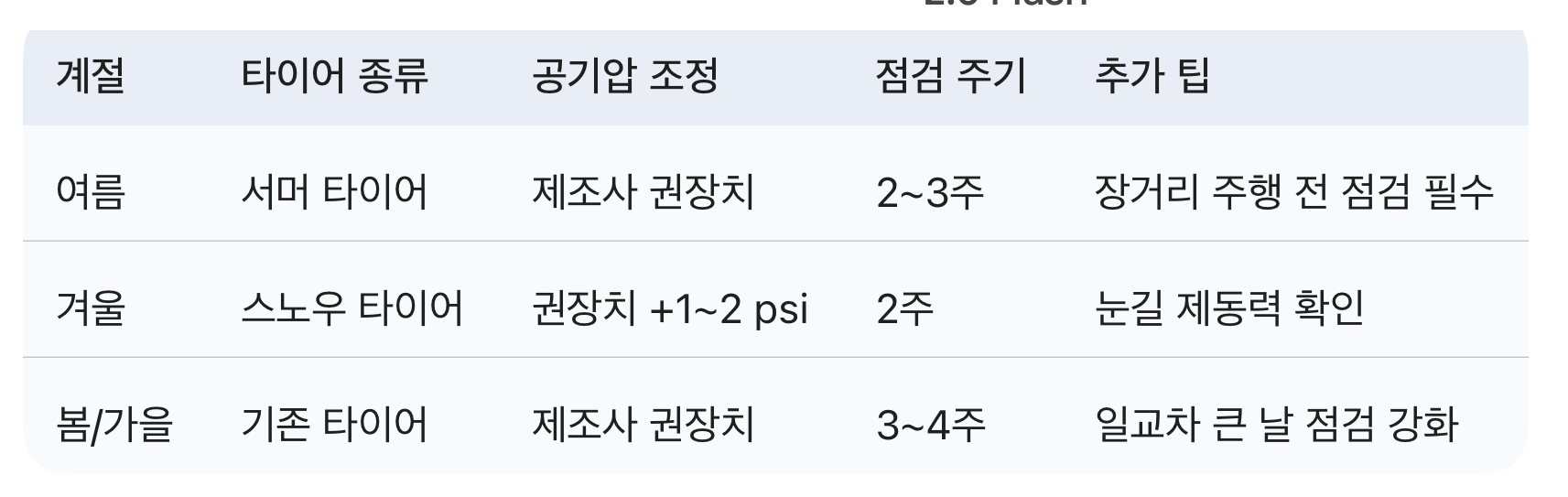 아래 표는 계절별 타이어 관리를 위한 간단한 체크리스트입니다. 출력해서 차량에 붙여두면 유용할 거예요!