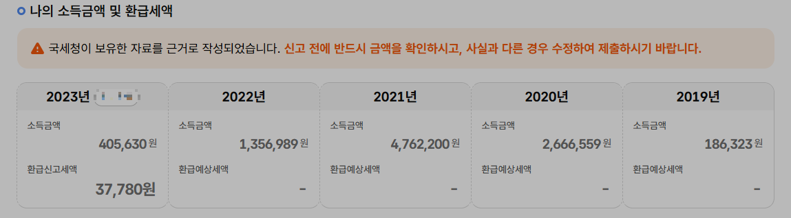 홈택스에 로그인하자마자 저는 2019년부터 2023년까지 5년간의 환급 가능한 금액을 한 화면에서 볼 수 있었습니다. 각 연도별 환급 내역과 총액이 명확하게 표시되어 있어 그동안 몰랐던 제 돈을 한꺼번에 확인할 수 있었죠.