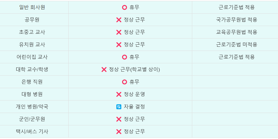 하지만, 공휴일이 아니기 때문에 직종에 따라 휴무 여부가 달라집니다.