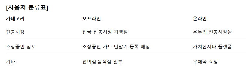 - 사용처 : 전국 전통시장, 소상공인 가맹점, 온누리 전통시장몰, 가치삽시다, 우체국 쇼핑 등