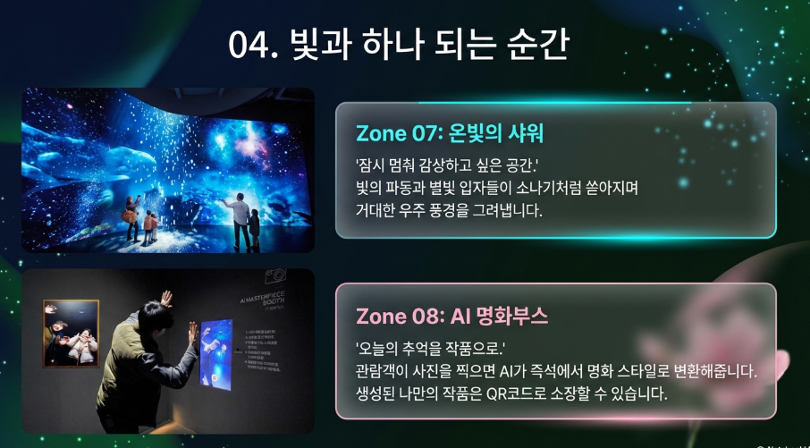 파노라마형 벽면 영상과 명화 콜라주로 몰입감 극대화.