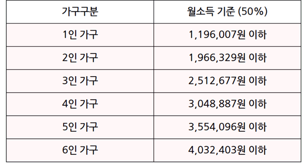 * 소득 기준: 가구 전체의 소득인정액이 기준 중위소득 50% 이하