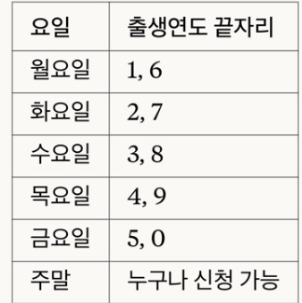 ※ 7월 21일~25일은 출생연도 끝자리에 따른 요일제 적용
