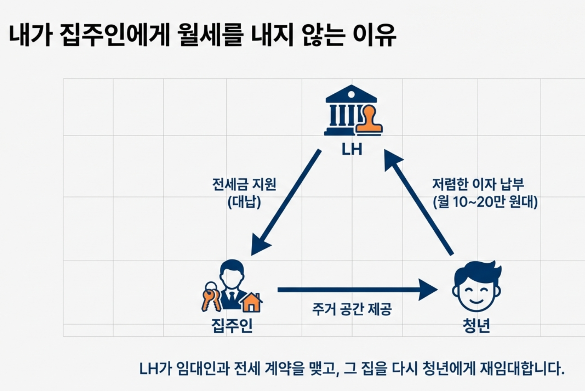 LH가 대신 전세금을 내주고, 청년은 이자만 부담하는 구조입니다.