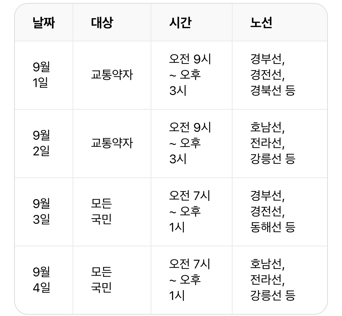 •교통약자 예매: 65세 이상 고령자, 등록 장애인, 국가유공자가 대상입니다. 코레일 홈페이지의 ‘명절 예매 전용 페이지’ 또는 코레일톡 앱에서 예매 가능하며, 회원가입이 필수입니다.