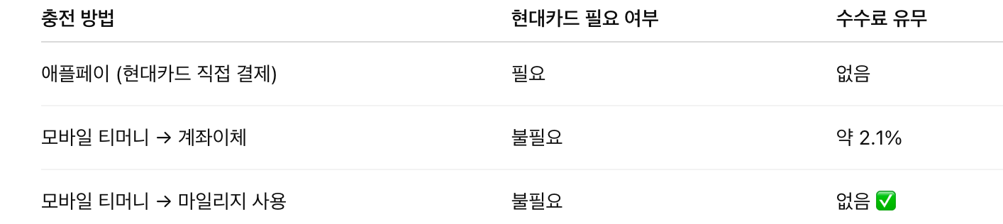 💡 팁: 현대카드가 없다면 마일리지 충전이 가장 경제적입니다.