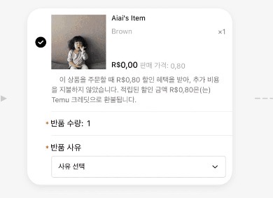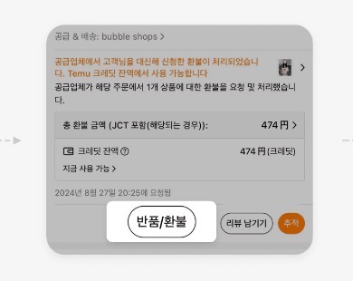 - Temu 앱 또는 웹사이트 로그인 → '내 주문'에서 해당 주문 선택 → '반품/환불' 버튼 클릭