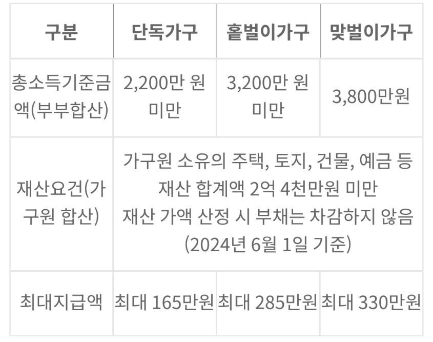 ▶소득조건 : 총소득이 단독가구 연 2200만 원, 홑벌이 3200만 원, 맞벌이 3800만 원 미만