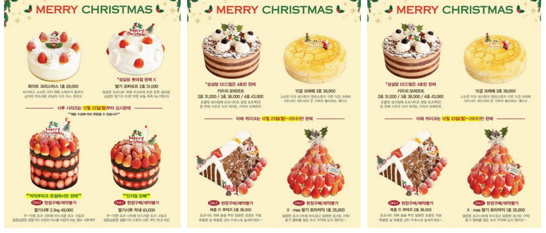 크리스마스 케이크는 12.19 ~ 12.25까지 판매되며, 일부 제품은 재고에 따라 조기 마감될 수 있습니다. 크리스마스 후에도 특별한 연말 케이크가 준비되니 참고하세요.
