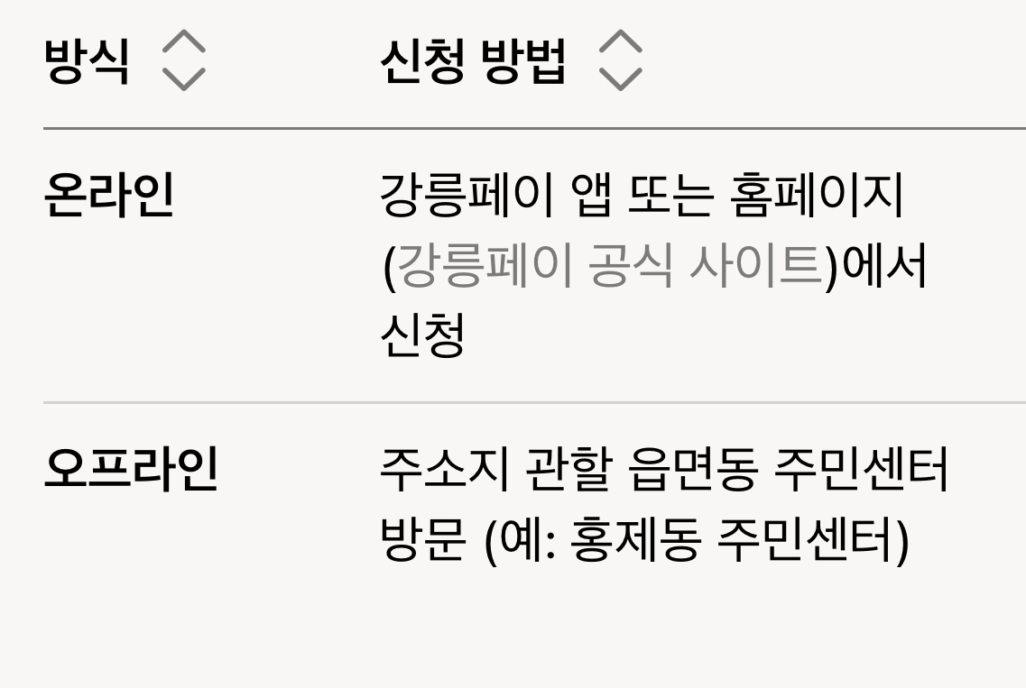강릉페이는 앱/홈페이지 또는 주민센터에서 신청할 수 있어요.