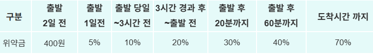 A5. 출발 2일 전까지는 400원, 그 이후로는 시간대별로 5%~70%의 위약금이 부과됩니다.