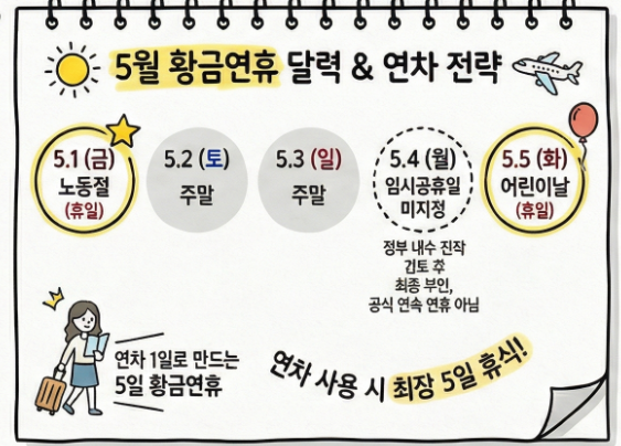 입법조사처의 분석에 따르면, 임시공휴일의 내수 진작 효과는 제한적인 반면 조업일수 감소로 인한 수출 타격(전년 대비 10.2% 감소 등)이 발생할 우려가 있기 때문입니다. 따라서 5월 4일은 평일로 유지되며, 5일의 황금연휴를 누리기 위해서는 개인 연차를 활용해야 합니다.