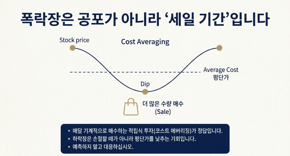 ✔ 폭락장은 손절 시기가 아니라 ‘평단을 낮추는 세일 기간’입니다.