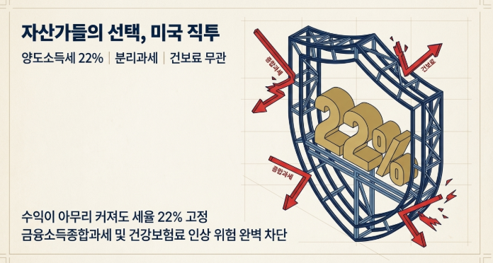 반면, 해외 직접 투자는 수익이 얼마든 22% 분리과세로 끝나며 건보료에도 영향을 주지 않습니다.