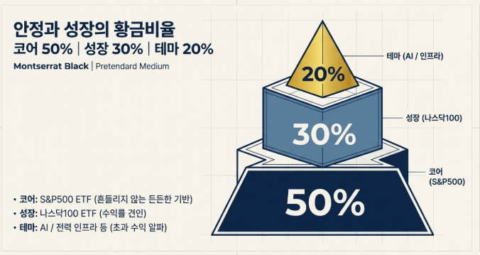 - 코어(50%): S&P 500 ETF - 절대 망하지 않는 투자의 기둥입니다.