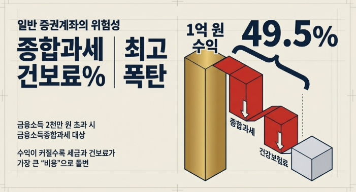 똑같은 S&P 500에 투자해 1억 원의 수익을 냈더라도, 일반 주식 계좌를 이용했다면 최대 49.5%의 종합소득세와 건강보험료 폭탄을 맞을 수 있습니다.